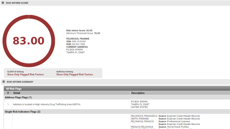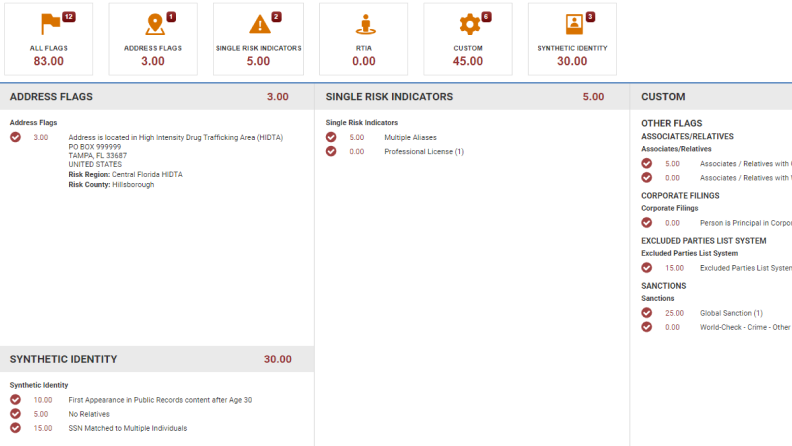 Save time during analysis by receiving flags for synthetic identities, criminal and arrest records, sanctions, and other risky affairs.