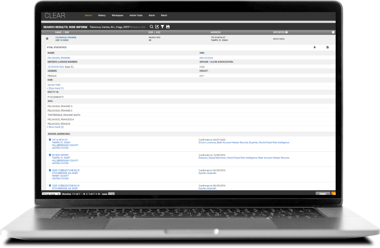 Corporate and government professionals use CLEAR Risk Inform to mitigate risk and prevent fraud