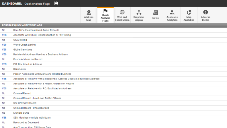 Easily evaluate if additional investigation is warranted on an individual or company with a checklist of adverse indicators.