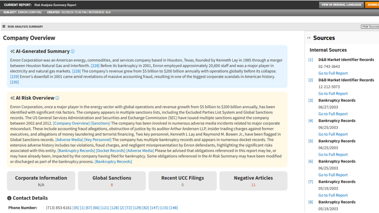 Skillfully combining GenAI with premium CLEAR data, this new business report option provides concise insights into corporations and organizations of interest. Its easily digestible overview of key points and web presence streamlines investigations and due diligence.