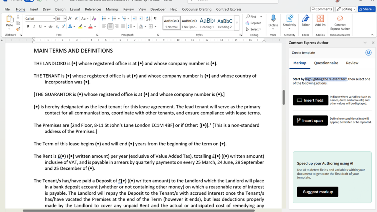 Reduce time spent writing, editing, and reviewing contracts and other legal documents with the clean, simplified authoring experience provided by Contract Express. Using our proprietary, AI-powered authoring tool, you can quickly move through the drafting process and present completed documents for markup in Microsoft Word, where another user can validate it or suggest changes.