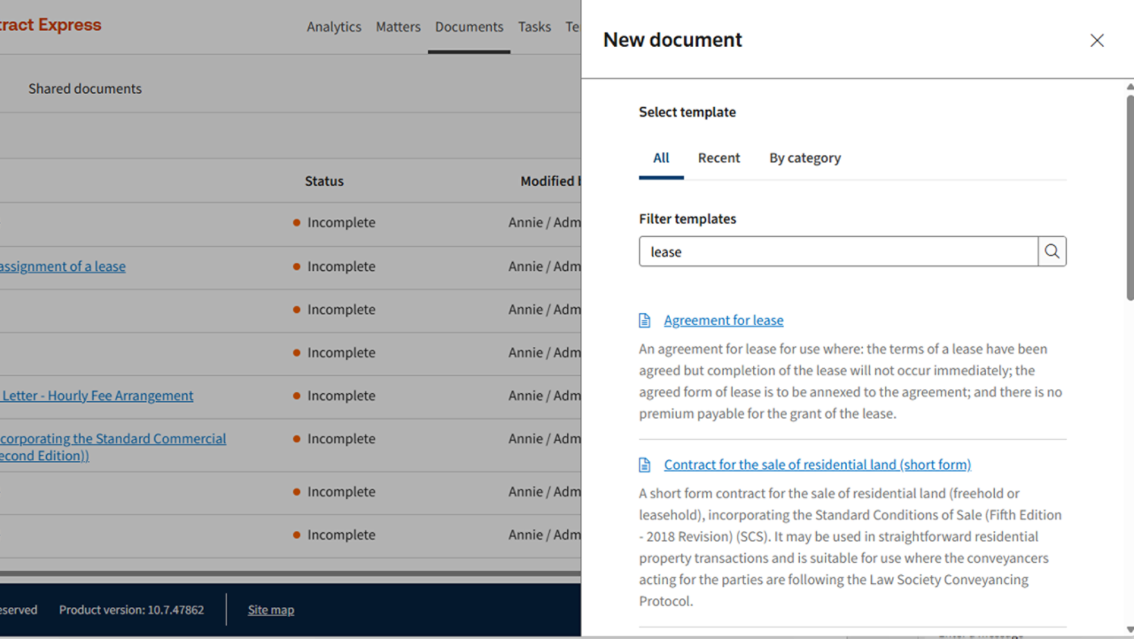 Access a single starting point for building legal documents with Contract Express, relying on guided questionnaires to create single documents and document suites based on the specific information you provide. With document previews, workflow and task management, and pre-automated precedents, self-service document creation has never been simpler.