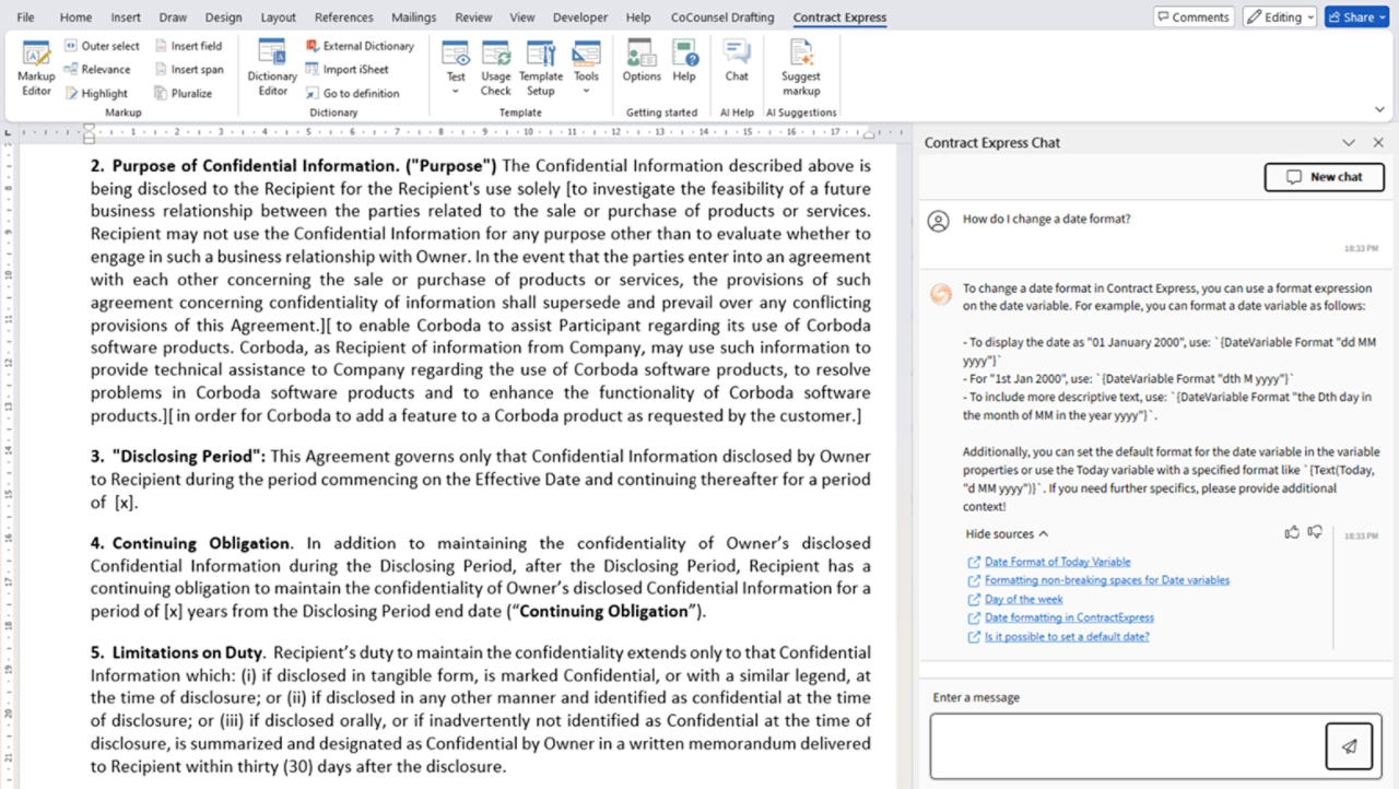 Ask questions in plain language and get reliable answers fast. Contract Express uses natural-language processing to answer your questions and provide guidance as you move through the drafting process. When you engage with the chat feature and describe what you want to achieve, you will receive specific code suggestions and other guidance so you can make it happen.