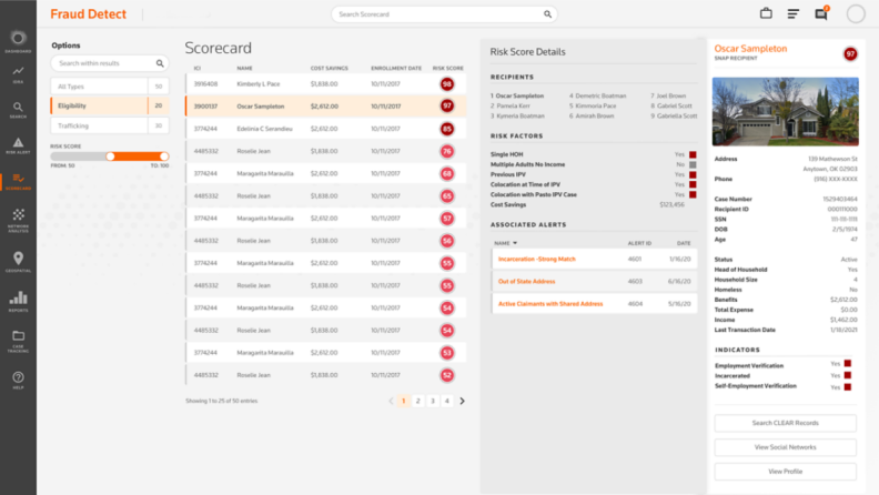 Specifically for SNAP agencies, this feature provides additional information about claimants. It allows investigators to drill down to see detailed information about SNAP benefit recipients and visualize transaction activities over a specific timeframe.